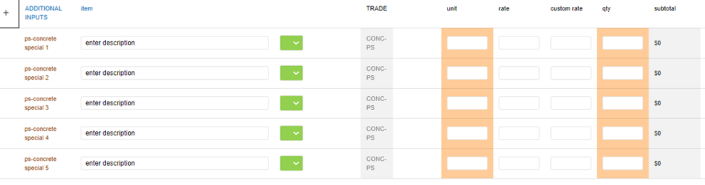 If there are line items that aren’t shown in the Trade Area that are relevant to the project, you can add custom lines at Additional Inputs. By selecting the plus sign, the Additional Inputs open and you can add these items here.