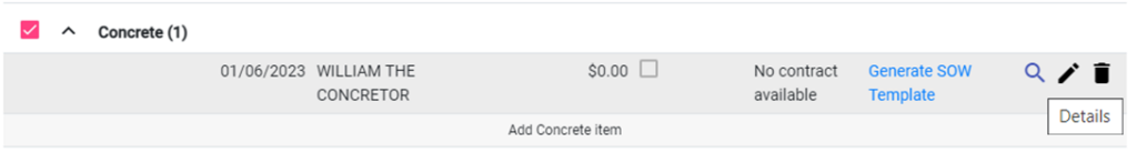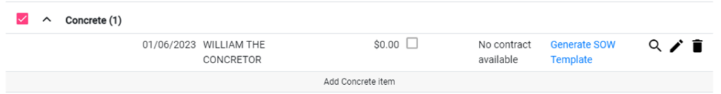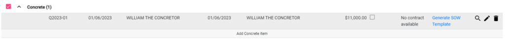 Step 8 Back at the quote list, you will see that there is a (1) beside Concrete, indicating that 1 trade or supplier has been selected. You can add multiple trades or suppliers to this line.