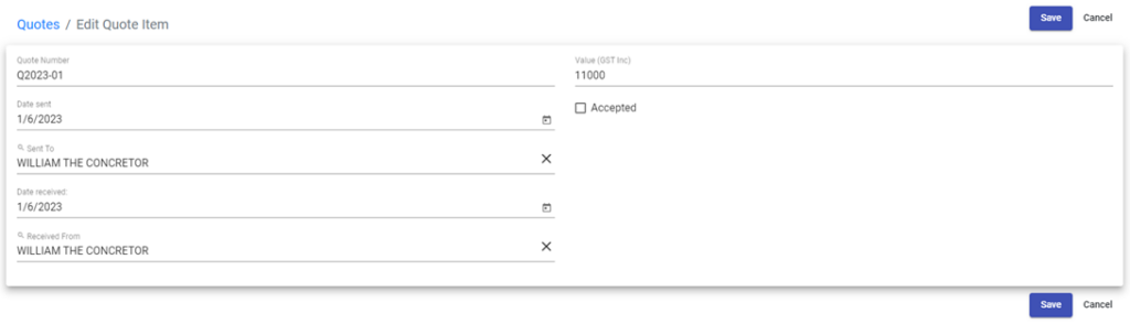 Step 4 This information is added to track the dates the quoting stage or tender stage started, what the Preliminary estimate amount was, so that it is easily tracked when finalising the Quote. At this stage, add the Consultation Request date, any notes, the Preliminary Quote amount and the date, and if a Preliminary Agreement (Pre-Contract) was used, add the details, and upload the document. The Final Quote information can be added once the Final Quote has been prepared. Save.