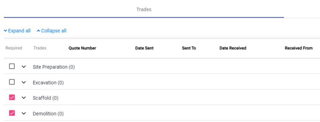 Step 5 Now a list of Trades and Suppliers has been populated. Use the checkboxes to indicate the trades and suppliers that you will need quotes from.