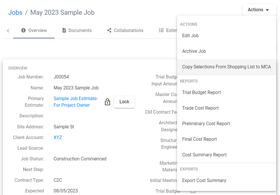 Step 1 Access the Job, ensuring the correct Estimate is the Primary Estimate.