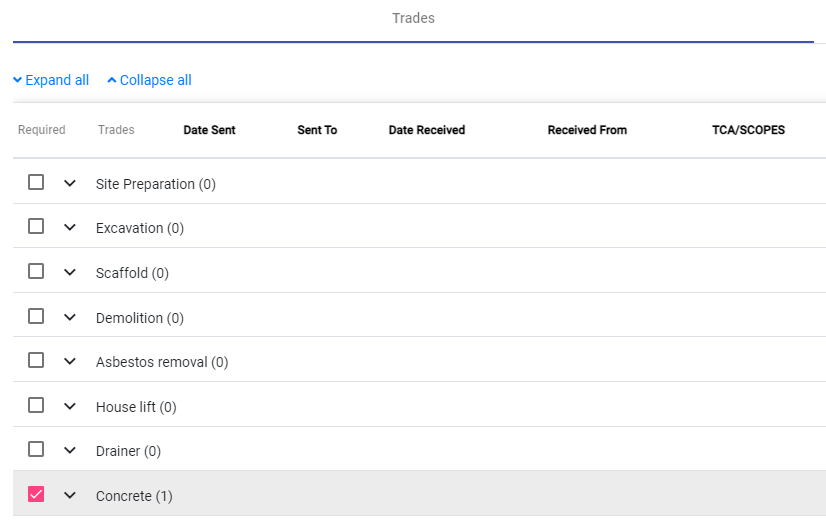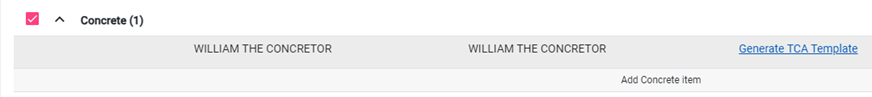 When you have used Quotes and Accepted a Quote, this will trigger the TCA to be able to be accessed from Contracts for that trade or supplier. In the example at Concrete, you can see the number (1) – this is indicating where the Quote is now accepted and linked to the Trade Contract Agreement.